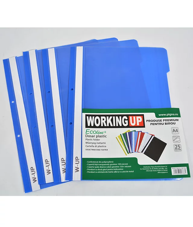 Dosare confectionate din polipropilena 150microni. Coperta din fata este transparenta si are grosime 100microni. Sunt prevazute cu 2 gauri pentru indosariere si au eticheta alba pe lateral. Ambalare: 25/set.