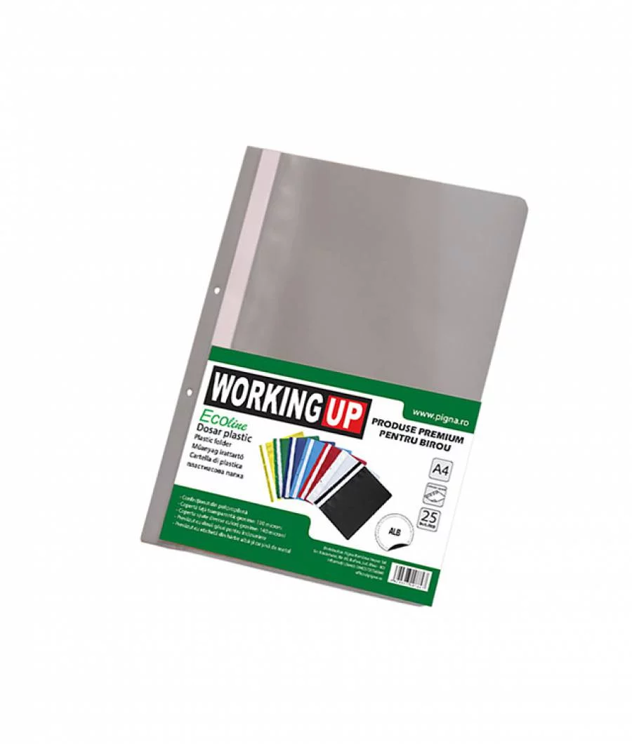 Dosare confectionate din polipropilena 150microni. Coperta din fata este transparenta si are grosime 100microni. Sunt prevazute cu 2 gauri pentru indosariere si au eticheta alba pe lateral. Ambalare: 25/set.
