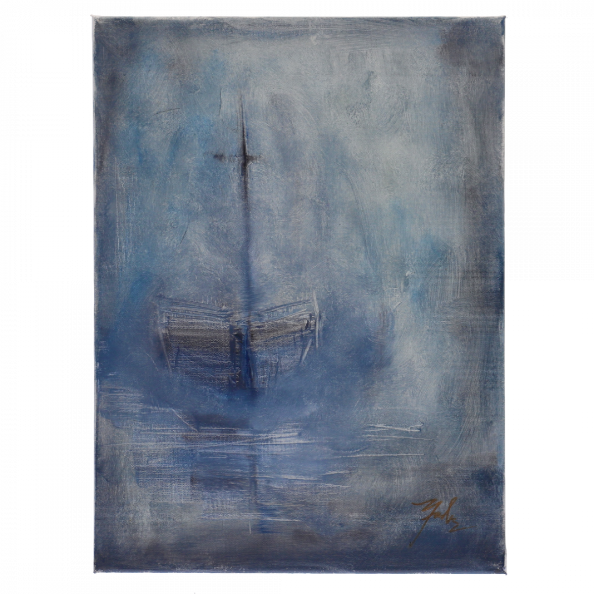O lucrare captivantă ce explorează tema izolării și a liniștii absolute. Pictura redă silueta unei ambarcațiuni (sau a unui catarg) ce pare să plutească într-un peisaj oniric, dominat de nuanțe de albastru prusac, griuri reci și alb lăptos.