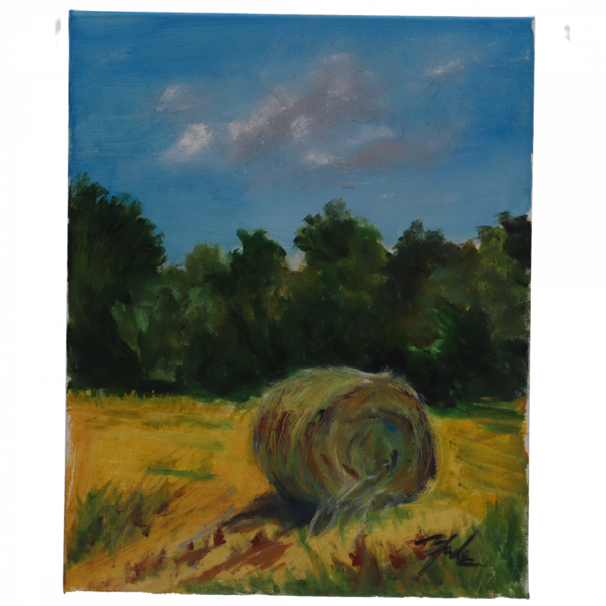 O scenă pastorală plină de viață, realizată într-un stil impresionist modern. Piesa centrală, un balot de paie surprins sub lumina puternică a soarelui, domină compoziția printr-o textură bogată și umbre profunde care îi dau volum. Contrastul dintre galbenul auriu al câmpului și verdele crud al pădurii din fundal creează o senzație de prospețime și liniște rurală.